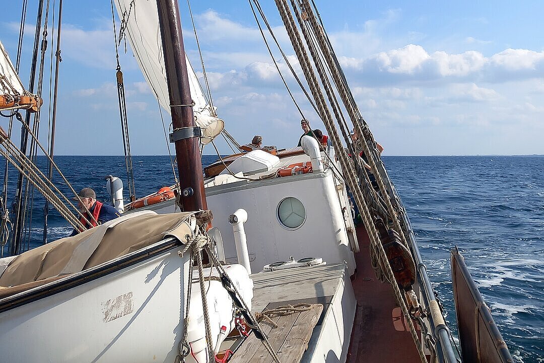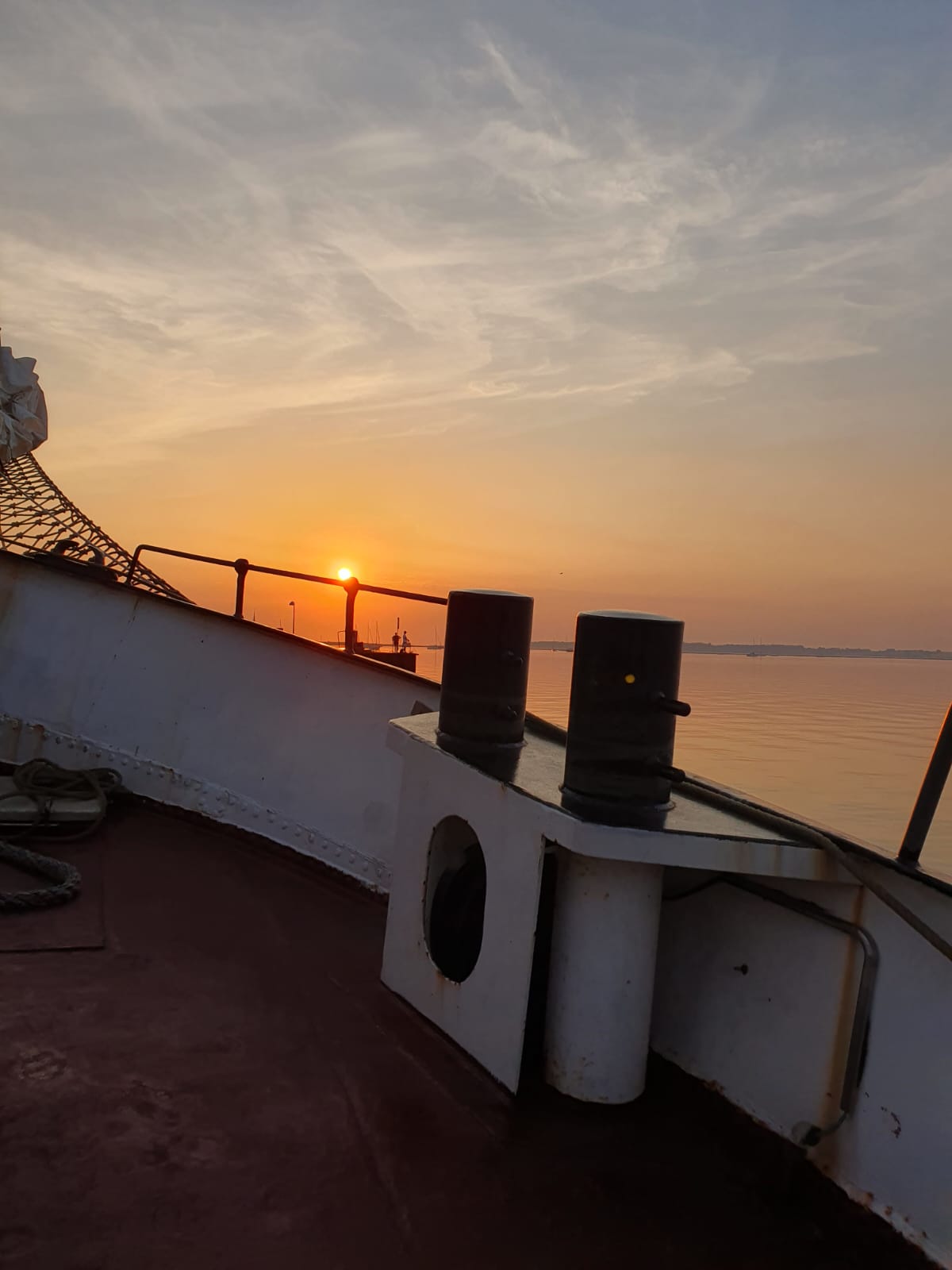 Unser KlimaSail-Törn führte uns in diesem Jahr mit der Amazone von Rostock nach Kiel, mit einem besonderen Ziel: in Svendborg das Steuerrad des 2023 abgewrackten Jugendsegelschoners, der „Zuversicht“ abzuholen. Bei bestem Wetter, viel Sonne und anfangs wenig Wind starteten wir mit vorbereitetem Mittagessen und großem Bord-Einkauf in unsere gemeinsame Woche. Nach den ersten Segelmanövern ließen wir am Abend den Anker fallen, besprachen Erwartungen und schlossen den Bordvertrag. Schon in der ersten Nacht übernahmen wir in Teams die Ankerwache, am nächsten Morgen gab es dementsprechend viele spannende Geschichten zu erzählen.