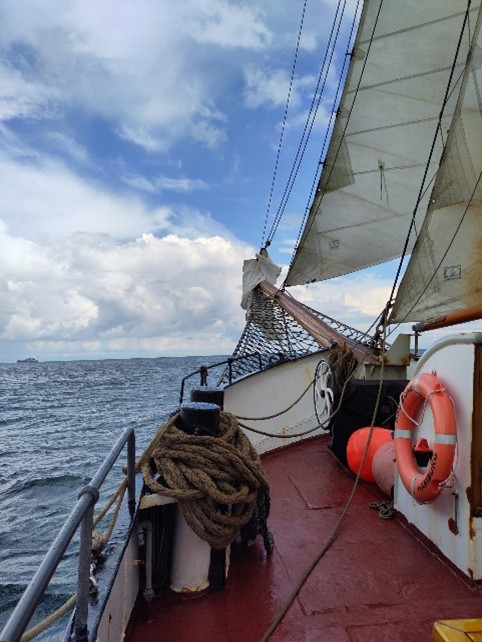 Ein Highlight für viele war auch der Meeresbiologie-Tag, an dem wir in einer Bucht vor Anker gingen und vom Schiff schnorcheln gingen und dabei das Meer entdeckten, Wasserproben nahmen und mit einem Bodengreifer neugierig Schlamm und alles, was darin lebte, an Deck zogen. Anschließend konnten wir unsere gefundenen Lebewesen unter einem Mikroskop anschauen, Wassertests durchführen, Arten bestimmen und vieles mehr über das Ökosystem Ostsee lernen, welches uns diese Reise ermöglichte. Wir lernten auch, wie ein Segelschiff funktioniert, wie Manöver gefahren werden und wann „all hands on deck“ gebraucht werden. Zwischendurch gab es auch die Zeit, sich mit Hafenbüchern, Seekarten und Flaggen auseinanderzusetzen und der Crew Löcher in den Bauch zu fragen. Es war spannend zu lernen, was neben Segelsetzen und Steuern noch so alles zum Segeln dazugehört.